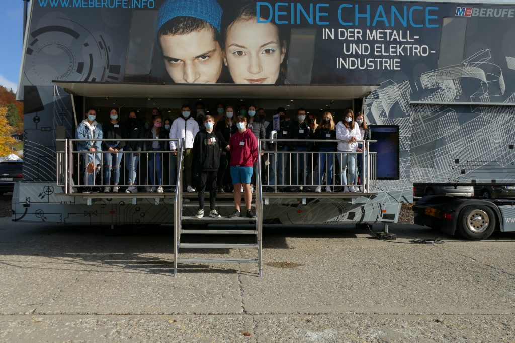 Kaum ein Kilometer Luftlinie liegen zwischen der Lammerberg-Realschule in Albstadt-Tailfingen und Mayer & Cie. Die rund 70 Schüler der Jahrgangsstufe 9 konnten das Ziel ihres Berufsinformationstags am 26. Oktober deshalb auch fußläufig erreichen. Für die 14- bis 15-Jährigen, die von drei Lehrern begleitet wurden, gab es an diesem Tag reichlich Einblicke in Sachen Ausbildung beim Rundstrickmaschinenhersteller. Neben einer Einführung durch Ausbildungsleiter Michael Fortenbacher konnten die Schüler und Schülerinnen einen Rundgang durch die Produktionshallen machen. Ein Teil der Gruppe besuchte zeitgleich den Ausbildungs-Truck der Südwestmetall.